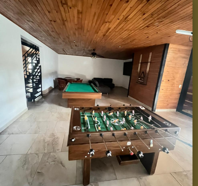 Salón de juegos completo con mesa de billar, mesa de póker y futbolito.